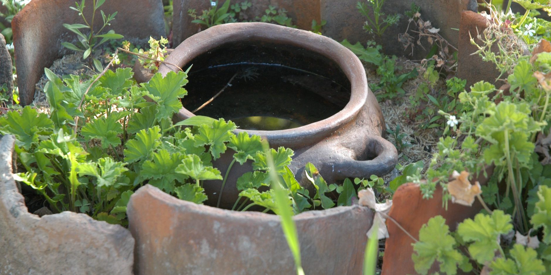 En nuestro sistema el agua se irriga desde el primero hacia otros niveles con una olla de barro. Mientras se mantenga la olla llena, el agua descenderá por capilaridad hasta lograr una saturación de la tierra del jardín. La cobertura o mulch ayuda a que la humedad se mantenga. La estructura de los niveles se logró usando tejas viejas que se enterraron veinte centímetros.